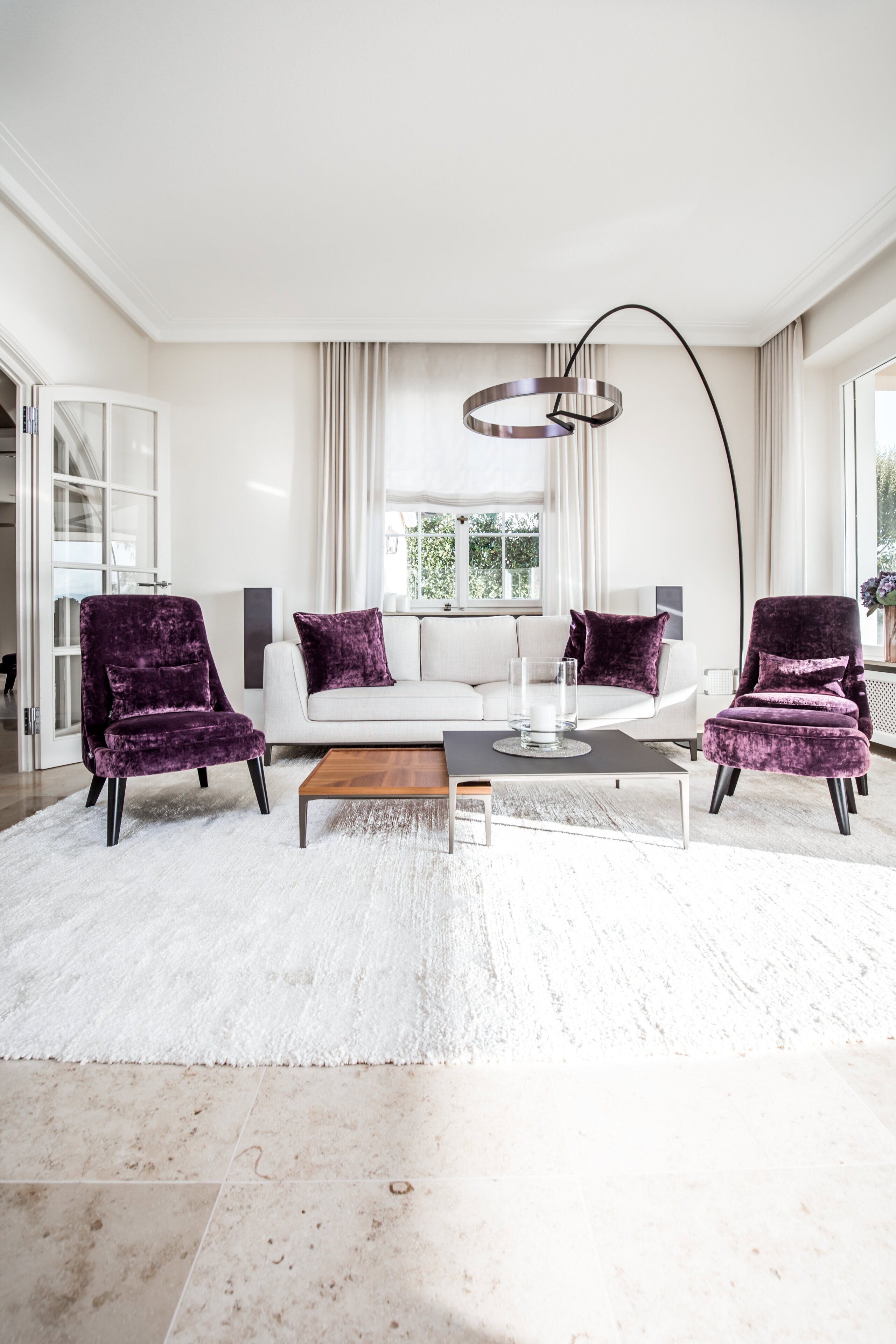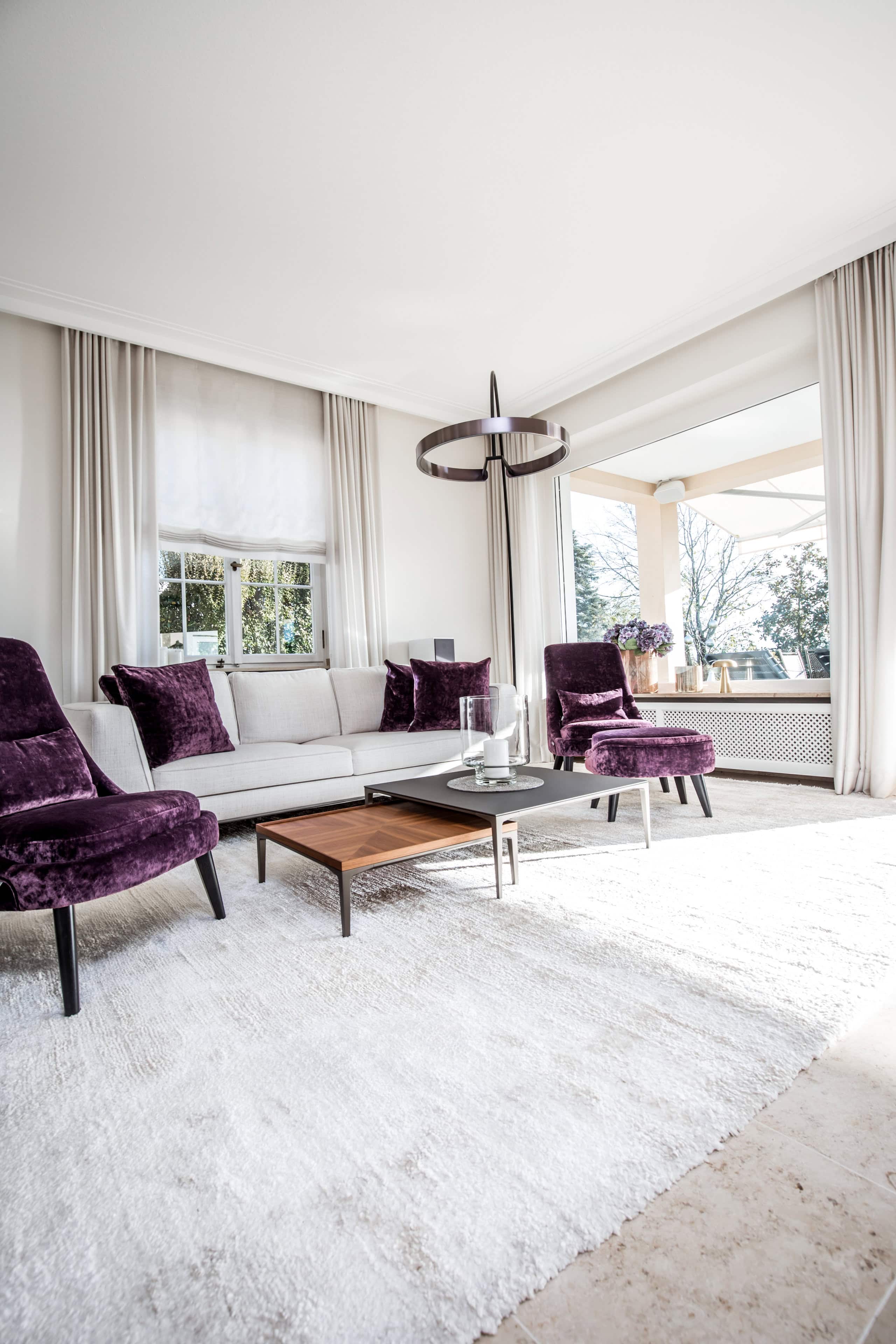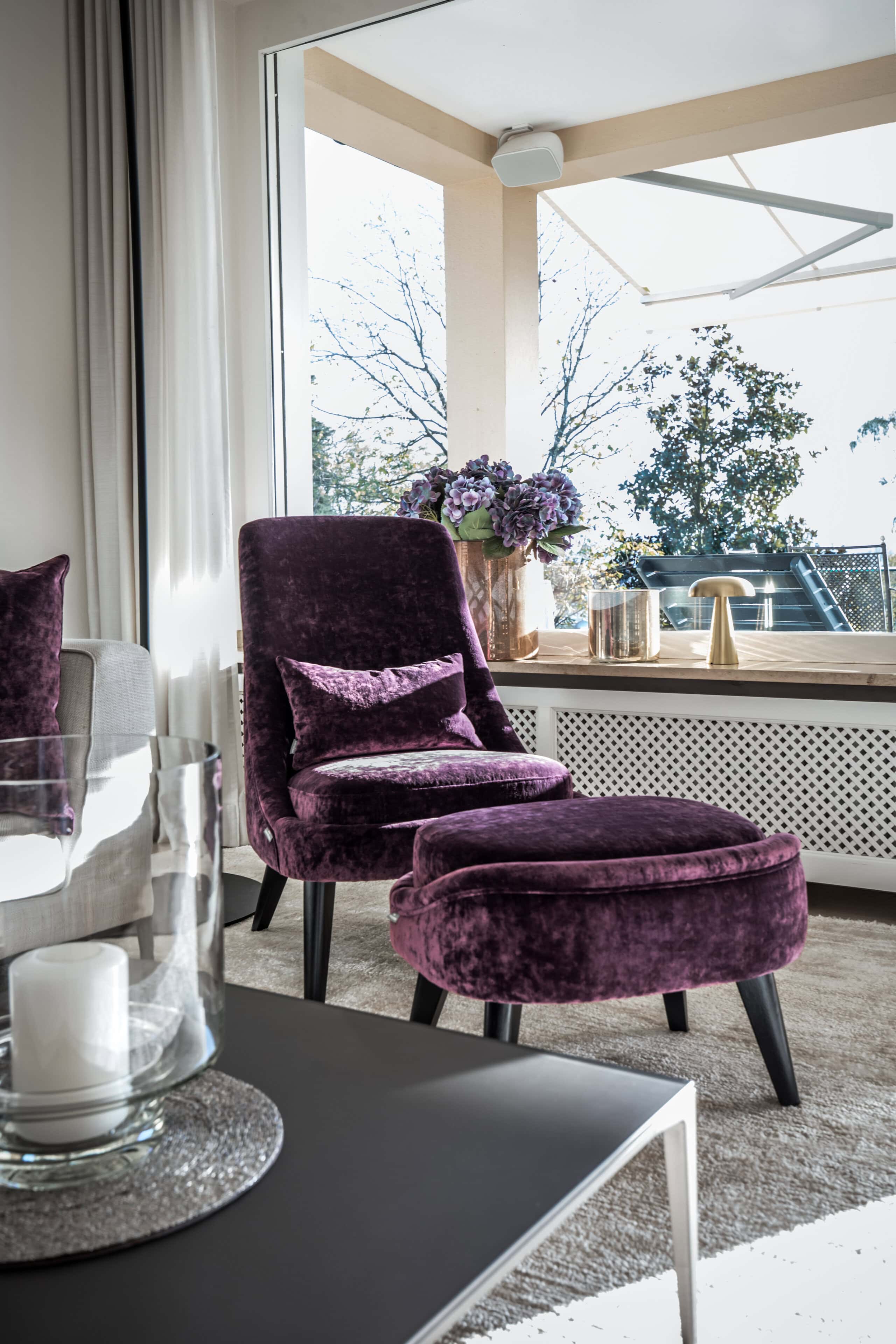 Ergänzt wird das Konzept durch zwei Sessel mit passenden Kissen in einem kräftigen Aubergine, ein ausdrucksstarkes Farbstatement, das Eleganz und Wärme perfekt verbindet. So entstand ein feinsinniges Zusammenspiel aus Licht, Farbe und Design, das den Unterschied spürbar macht.